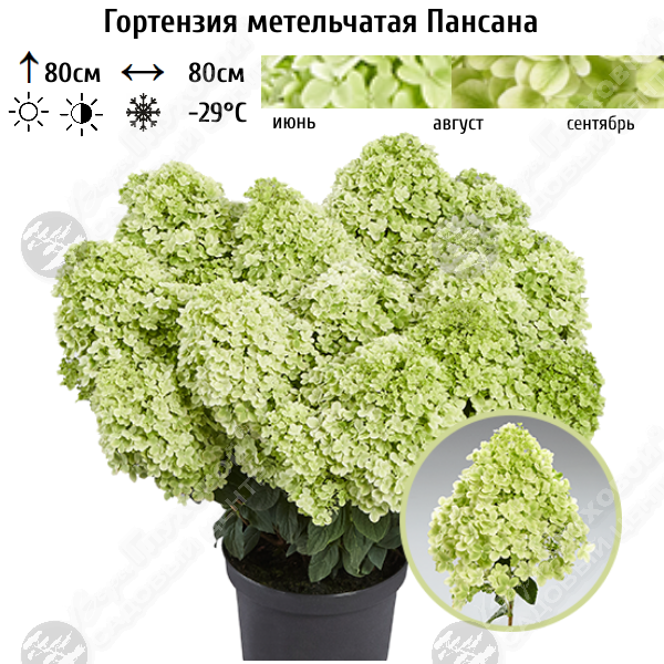 Метелки крупные, плотные, изумительно зелено -лаймового цвета. На солнечном участке или в легкой полутени цветение пышнее и ярче. Рано зацветает и обильно цветет с июня и до заморозков. Сорт зимостоек и нетребовательный в уходе.Благодаря своему компактному росту, гортензии этой серии хорошо смотрятся в низких садовых бордюрах, и очень декаративны в кашпо.